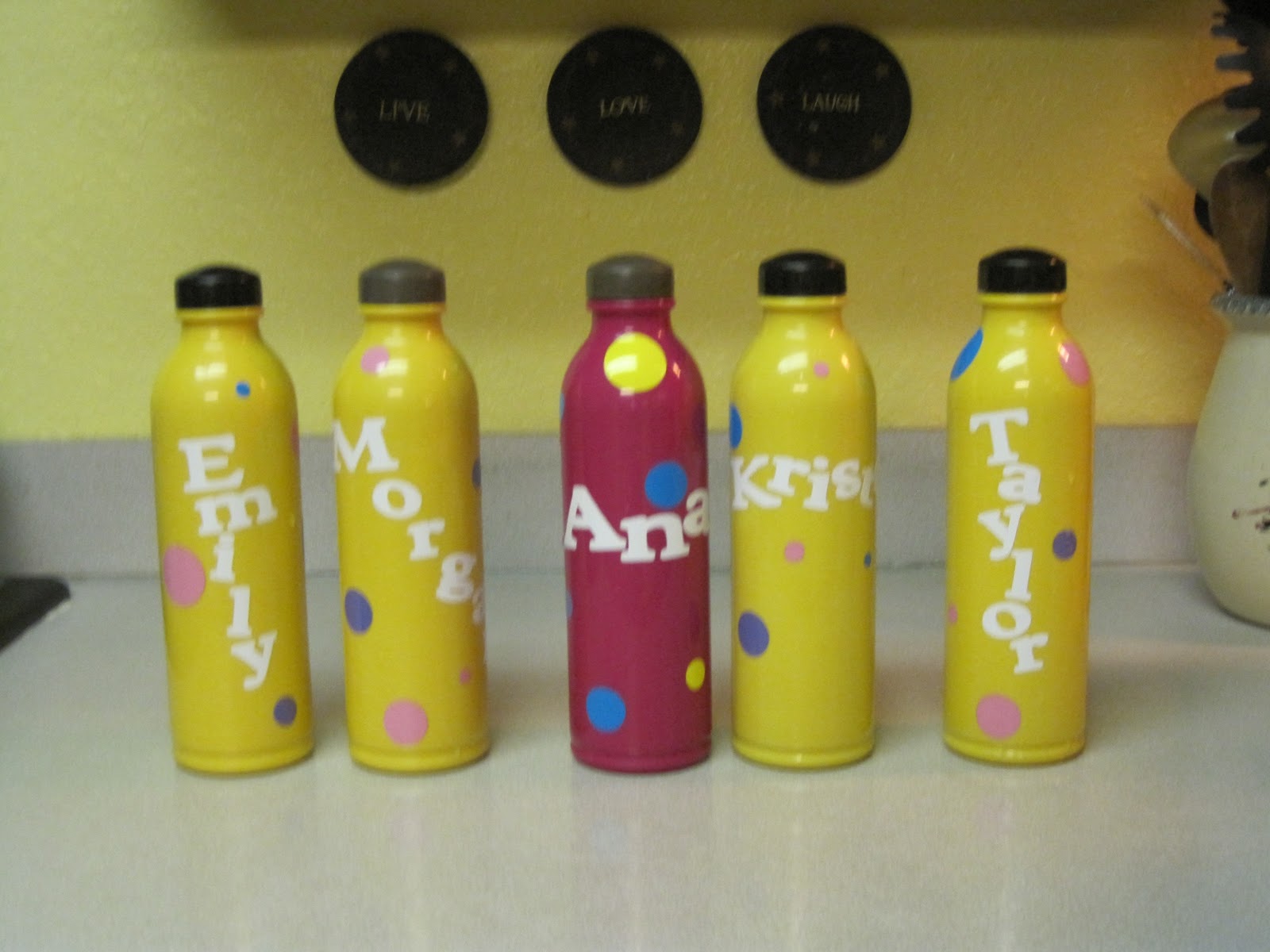 I knew I wanted to make water bottles with names so that drinks wouldn't be getting mixed up. I searched everywhere for bottles that were cheap. The Dollar Tree (like always) is were I found my answer. I purchased these little beauties for $1.00 each! Using my Cricut, I cut out vinyl letter and polka-dots. (What middle school girl doesn't love polka dots?)